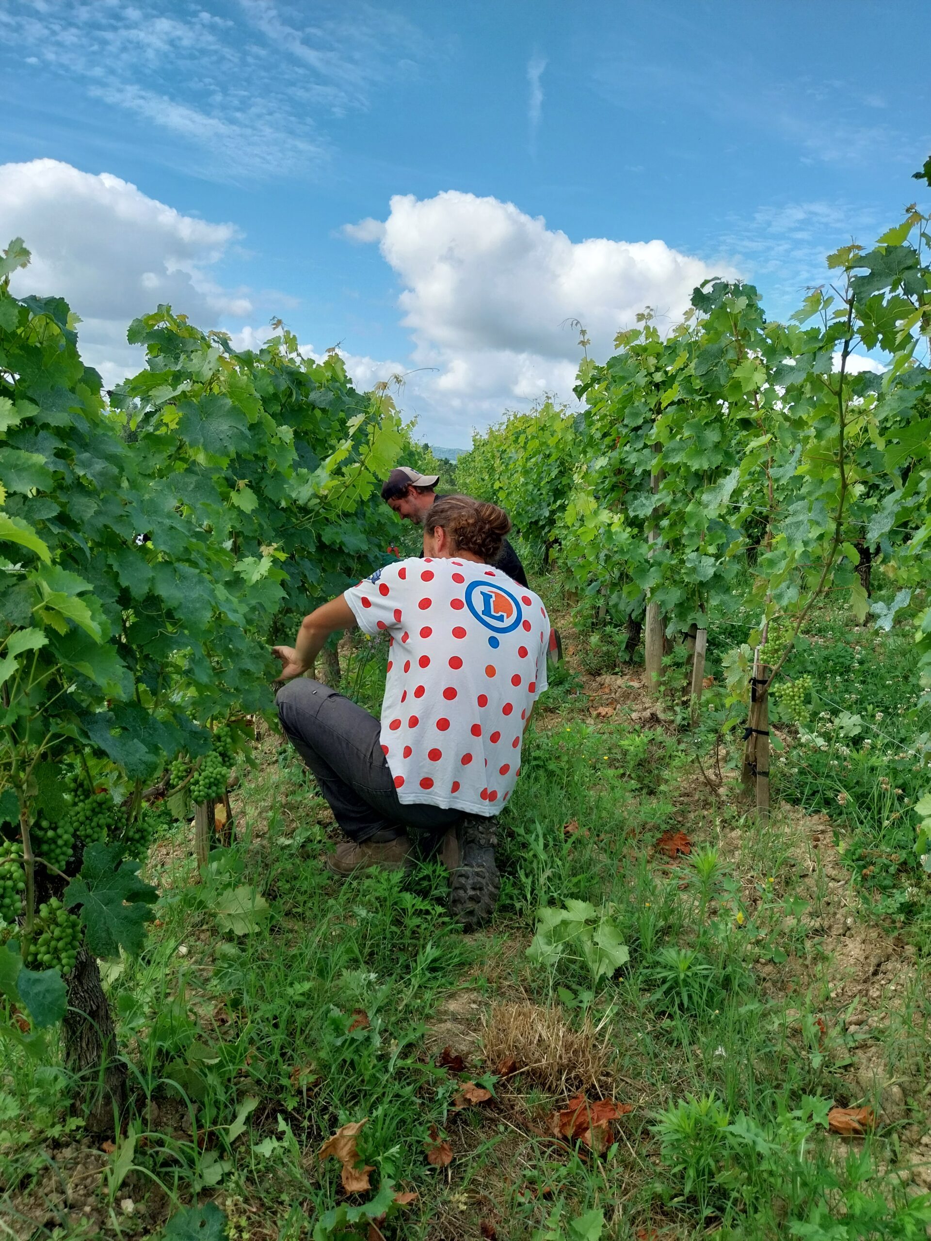 L’effeuillage correspond à la suppression des feuilles dans la zone des grappes. Ce travail permet de favoriser la véraison, c’est-à-dire le changement de couleur des baies de raisins, qui passent du vert au pourpre.