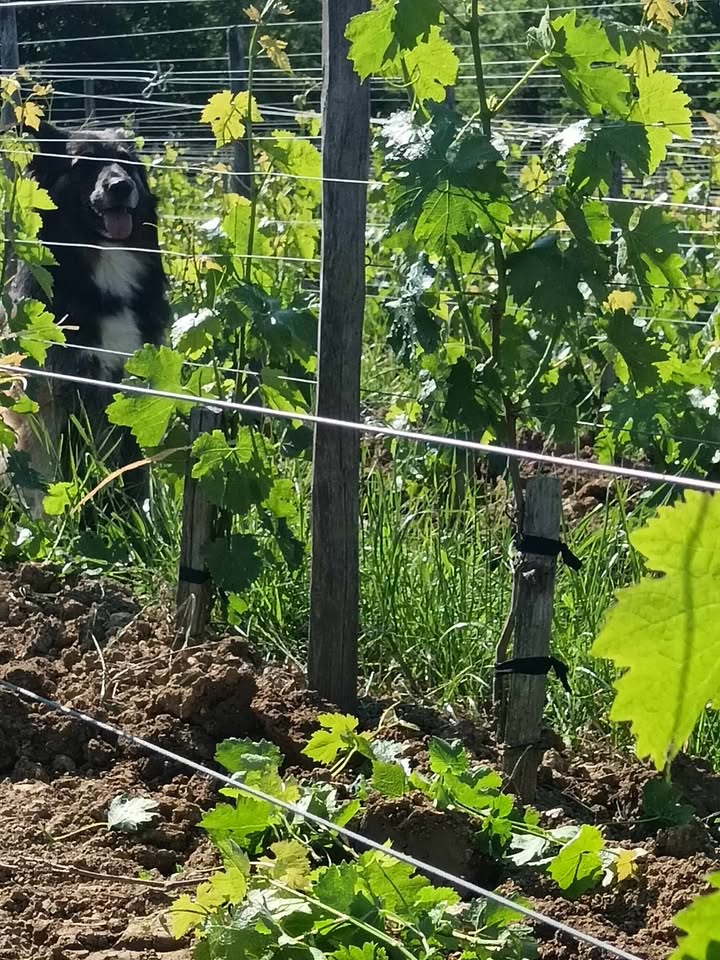 La vigne étant fixée par des fils de fer tendus entre des piquets, il convient de remplacer chaque année les piquets devenus défectueux. Sur la photo ci-dessous, Jérôme attache le fil de fer sur le piquet après avoir planté celui-ci dans le sol.
